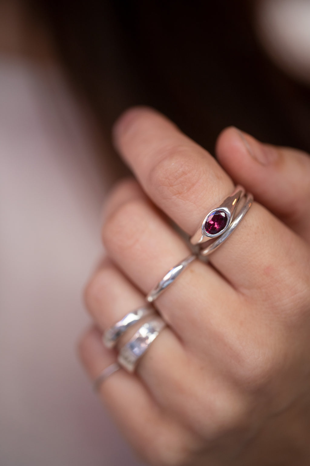 This deep red, oval rhodolite garnet is a part of our Bold collection. We always let the stone's natural character lead the design, and this one makes the ring heavy but smooth, one of our chunkier pieces in silver.